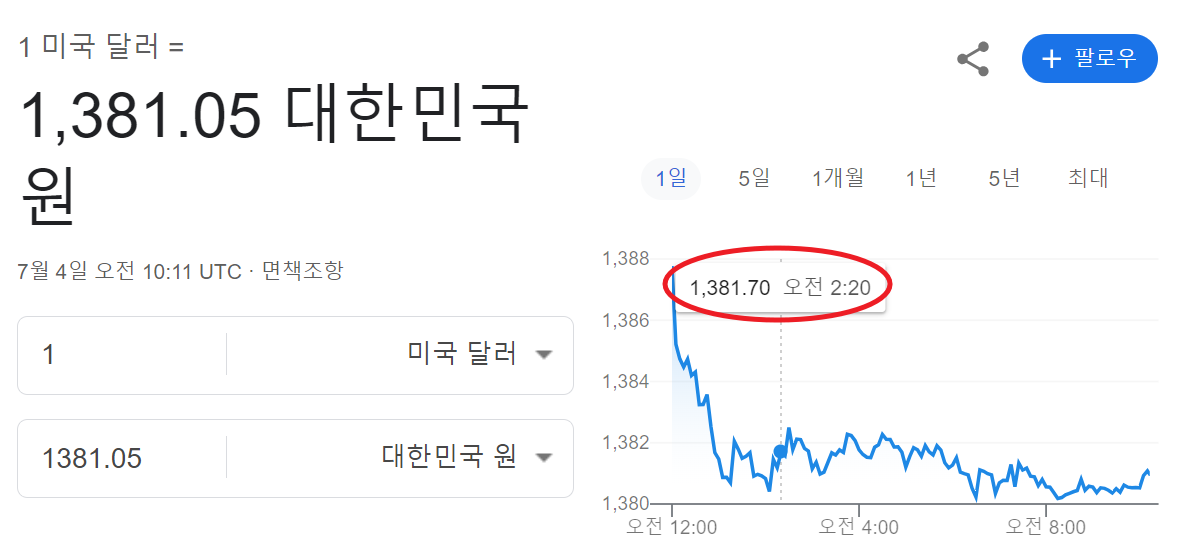 제가 달러박스를 캡쳐했을 때 시각이 2024년 7월 4일 오후 2:19 이었는데요. 구글에서 해당 시점의 달러 공시 환율을 보면 1381.70원으로 추가 수수료가 붙지 않을 뿐더러 송금환율이나 현찰 환율이 아닌 공시환율을 적용한다는 것을 볼 수있습니다. 그렇다면 이건 뭐 획기적인 제안인데요. 달러박스를 안 쓸 이유가 없네요. 아시죠? 저는 카카오뱅크와 아무 관련도 없고, 이런 멘트로 인해 아무런 금전적인 이익을 취할 연줄이 없습니다. ㅎㅎㅎ