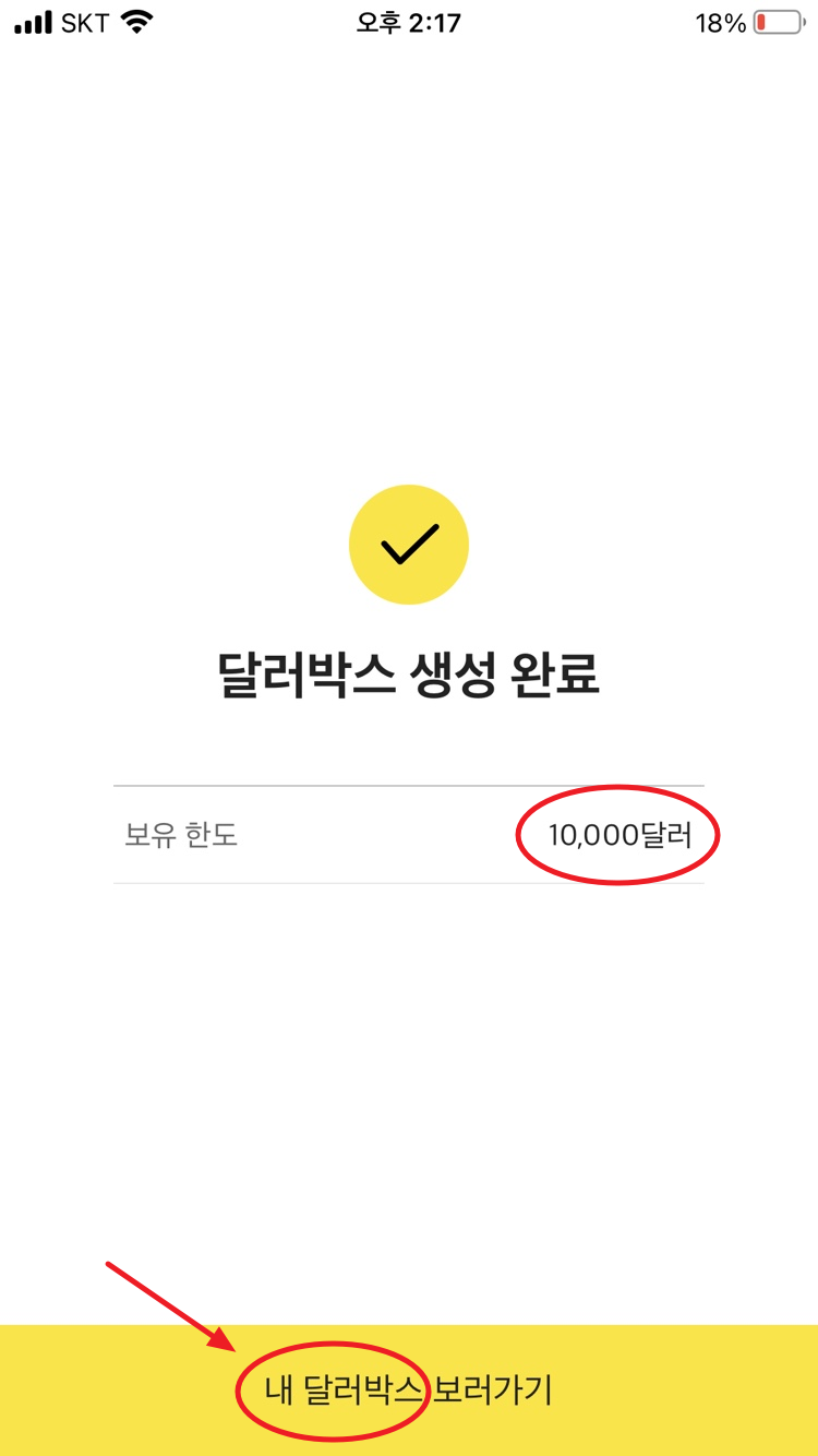 한화 보관 장소인 세이프박스는 최대 잔고가 1억이었는데요. 달러는 최대 잔고가 1만달러라고 합니다. 클릭 몇 번이면 정말 몇초만에 '내 달러박스'가 생성됩니다.